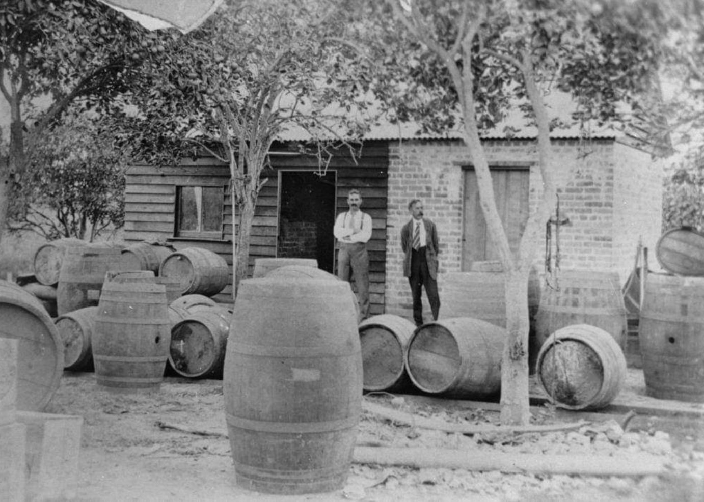 Plus, Michael sent a photo believed to be taken around 1912, of Henry (John) Banff and Hippolyte, who was a wine maker and excise officer at Clinton Winery, Coominya in Queensland standing outside the Bond Room of the Banff Bros winery where brandy was stored.